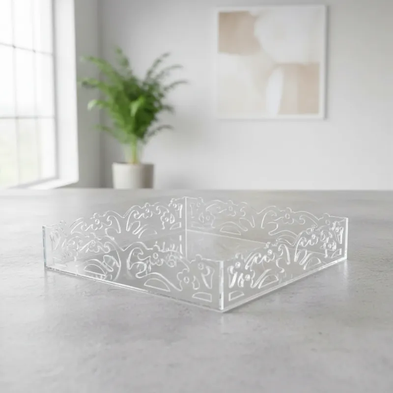 Ela esbanja sofisticação através de sua apresentação, onde foi produzida em Acrílico Crista (Transparente) deixando-a ainda mais glamourosa. Ideal para acomodar os acessórios que compõe a bancada, tal como sabonetes, porta algodão e difusores, ou ainda para manter organizados seus perfumes e apetrechos de beleza. Torne as bandejas parte da decoração do seu lar, elas são versáteis e apaixonantes!