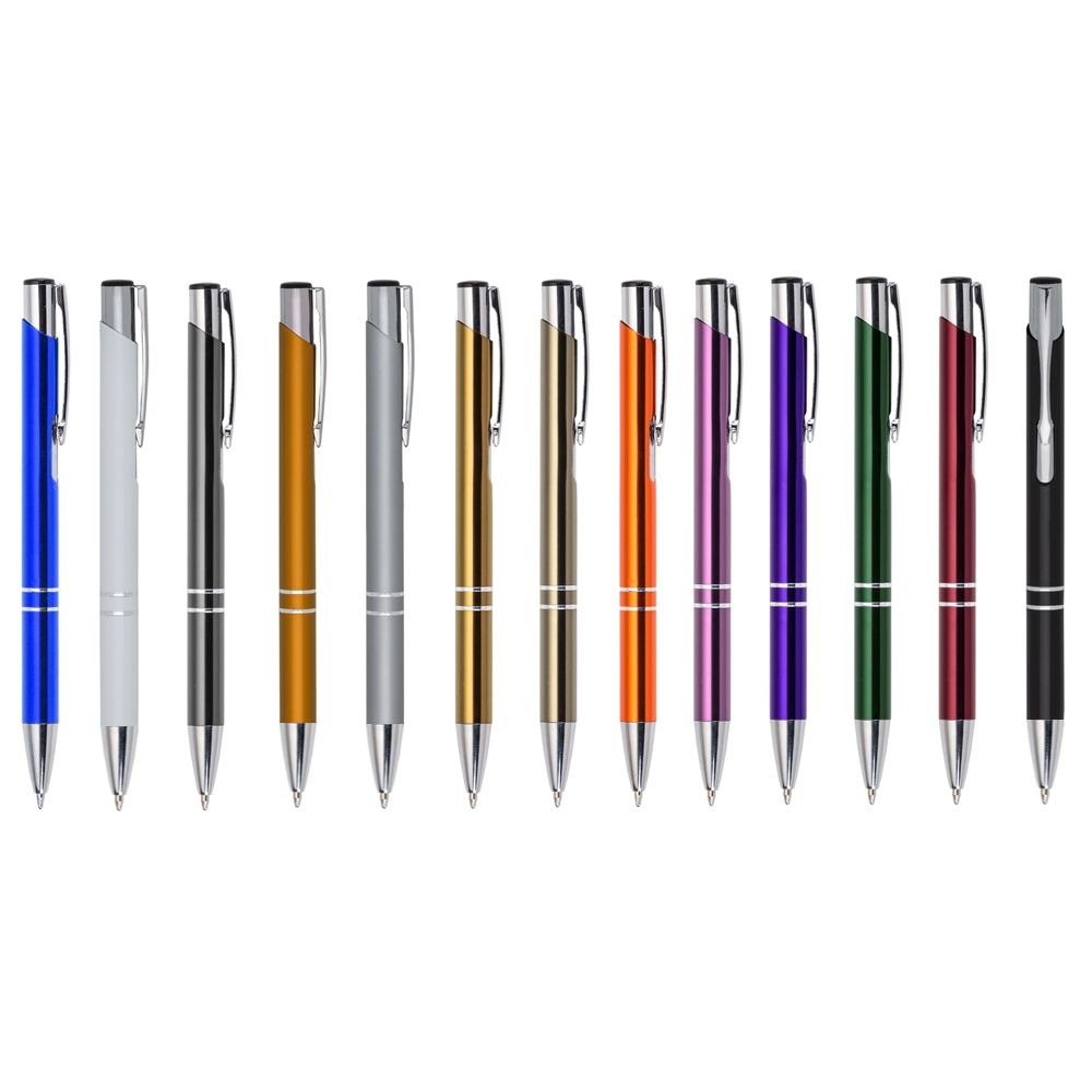 Caneta metal inteira colorida com detalhes prata. Clip de metal com a ponta do acionador preto, parte inferior com dois anéis prata. Aciona por clique. Indicado para promover e divulgar sua marca em feiras e eventos.