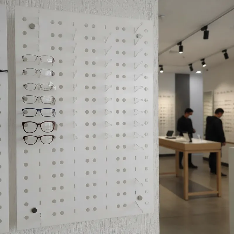 Painel de óculos confeccionado em Acrílico Branco ou Transparente na espessura de 3 mm nas dimensões de 70 x 65 cm e com 40 posições de óculos. Seu design sofisticado e super leve, proporciona maior visibilidade aos produtos expostos.